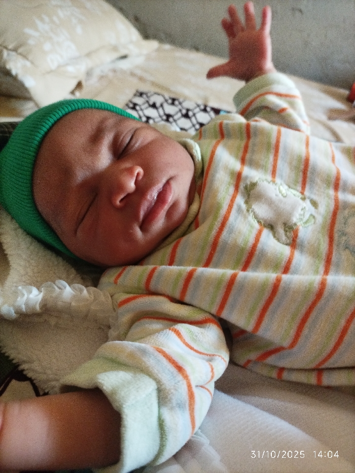 In the city of Pantame, Nigeria, an indoor scene depicts an infant lying supine on a bed. The infant, wearing a green knitted beanie and a striped full-body sleeper with orange, light green, and light blue stripes on a white background, is asleep with eyes closed and mouth slightly agape. An embroidered light-colored animal shape is visible on the sleeper's chest. The infant's left arm is extended to the side, while the right arm is raised with an open hand. Beneath the infant is a light-colored sheet, with a cream-colored textured blanket or towel positioned near the head. In the background, a light-colored pillow with a subtle pattern and a dark, geometrically patterned fabric are present. A timestamp of "31/10/2025 14:04" is visible in the lower right corner.