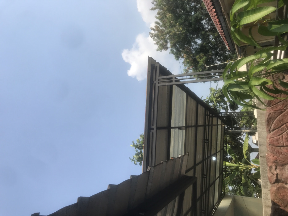 The image displays an outdoor scene in Limbangan Sari, Indonesia, characterized by clear blue skies with scattered white cumulus clouds. The foreground features a reddish-brown textured wall. Directly behind this wall, on the right, two plants with prominent green leaves are visible. A light-colored building wall is partially visible on the far left. A dark-framed metal canopy with a translucent corrugated roof extends across the mid-ground, supported by vertical metal pillars. A single white light fixture is suspended beneath the canopy structure. Above this canopy, several small green leafy plants are visible. To the upper left, a portion of a dark corrugated metal roof is present. In the background, to the right of the canopy, a cluster of mature green trees is visible. To the far right, a section of a residential building with a reddish-brown tiled roof is partially visible, with a thin metallic antenna or pole positioned in front of it. Further back on the left, under the canopy, a large banana plant is identifiable among other green foliage. No individuals, actions, or specific interactions are depicted.