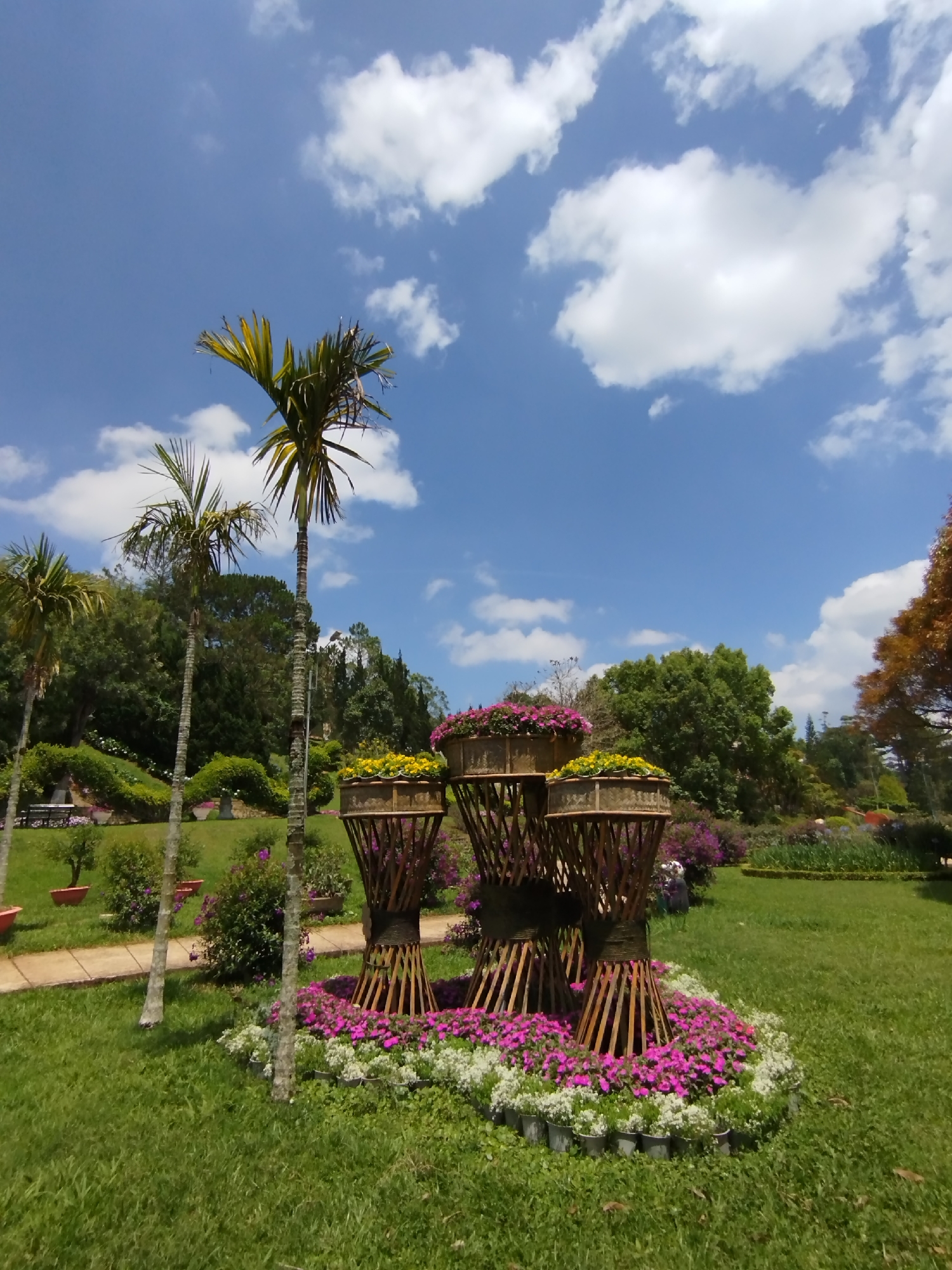 The image depicts a landscaped area in Lam Vien - Da Lat, Vietnam, featuring ornamental flower arrangements. In the foreground are three tiered flower stands constructed from bamboo, each holding planted containers of yellow and pink flowers. The base of the stands is encircled by a flower bed of pink and white flowers in gray pots. The flower stands sit on a mowed green lawn. Behind the flower arrangement are three tall, slender palm trees with smooth, gray trunks. Beyond the trees is a variety of green trees and shrubs, creating a park-like setting. To the left, a pathway and benches are visible. The sky is blue with scattered white clouds.