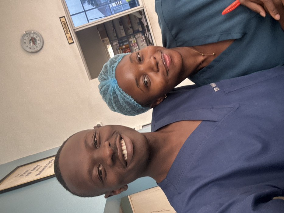 This image depicts two individuals, a male and a female, within an indoor medical or pharmaceutical facility located in Gura Top, Nigeria