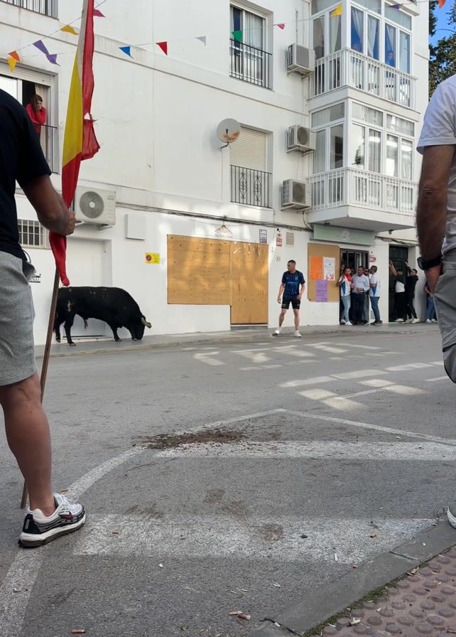 The scene captures a black bull standing in the middle of an empty street, with a man in a dark shirt and shorts standing nearby