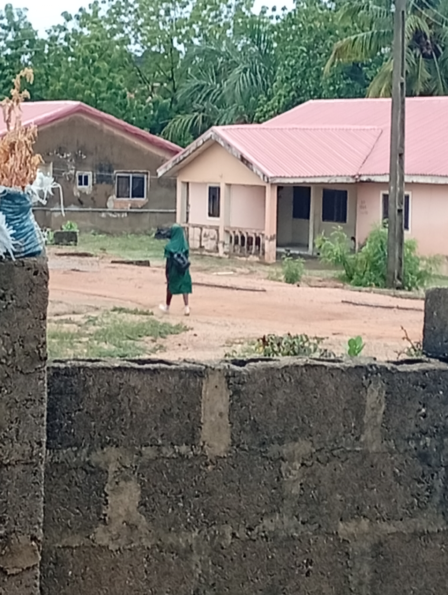 The scene is in Adankolo, Nigeria. In the foreground, a dark gray concrete block wall is visible. Behind it, a young person dressed in a green outfit and hijab walks away from the viewer on a dirt path. Two buildings stand behind the person. The building on the right has a pink roof and a tan exterior. A utility pole is adjacent to it. The building on the left has a red roof and a gray exterior. Green trees and foliage surround the buildings.