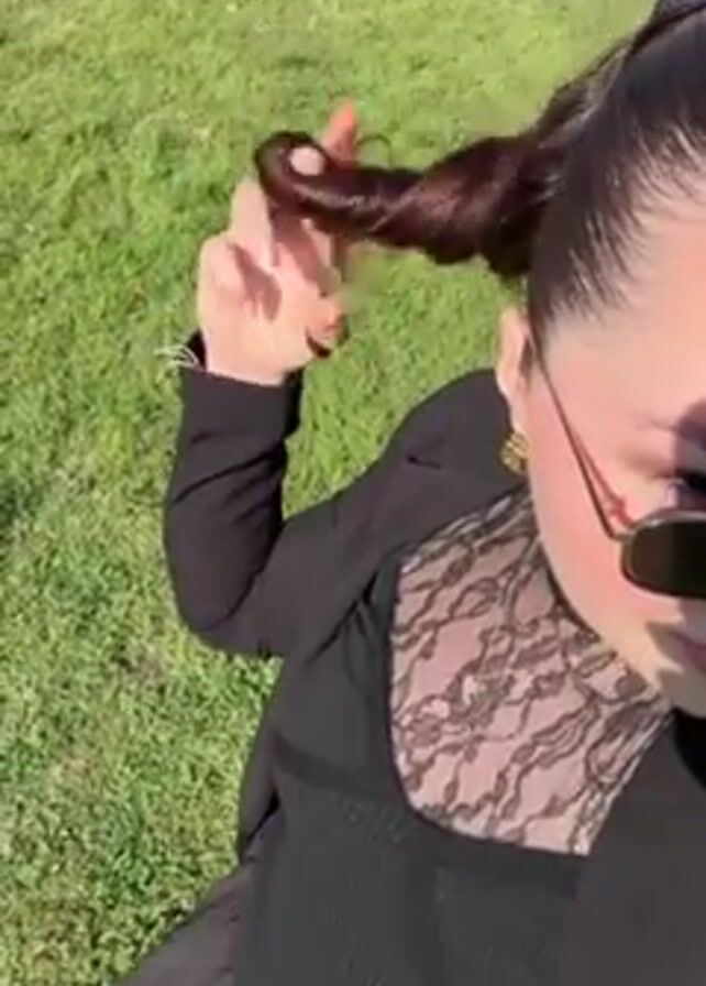 person in a black outfit standing on a green lawn. The person is holding the end of their dark brown ponytail and appears to be twisting it. They are wearing sunglasses and a black jacket over a black top with lace detailing. The background is a sunny green lawn. Other people are vaguely visible in the background. The camera appears to be hand-held and at a high angle, looking down at the subject.