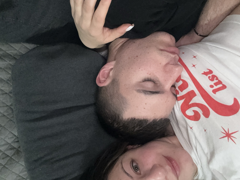 Two individuals are positioned in an intimate indoor setting. A light-skinned female with dark hair, visible left eye, and a slight smile on her lips, looks directly towards the camera. She wears a white t-shirt with a red graphic featuring the words "Nice list" and starburst designs. Her right hand, featuring white-tipped fingernails, rests on the left shoulder of the second individual. The second individual, appearing male with short dark hair and facial freckles, has his eyes closed and his head resting on the chest/shoulder area of the female. He wears a dark, possibly black, garment, and a thin, dark bracelet is visible on his left wrist. The background consists of dark grey, possibly quilted, upholstered fabric, suggesting a sofa or bed. The image contains no discernible visual elements to determine its geographic location in Varna, Bulgaria, or any other specific city.