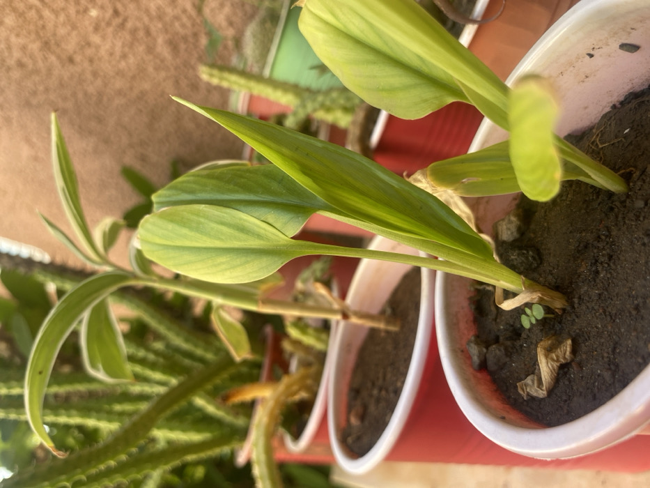 The scene depicts a close-up, slightly low-angle view of multiple potted plants in an outdoor setting in Barden Yana, Nigeria