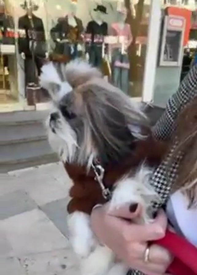 A woman holding a small, fluffy dog in her arms stands on a sidewalk in front of a storefront. The dog is mostly white, with patches of tan and gray fur, and is wearing a brown knitted sweater and a silver leash. Its fur is styled in small tufts held by small rubber bands on top of its head. The woman is wearing a patterned gray jacket. The storefront behind them has a glass facade, and mannequins dressed in clothing are visible inside. An ATM is also visible. The sidewalk is made of gray rectangular stones. The video is slightly shaky, as if filmed handheld while walking.