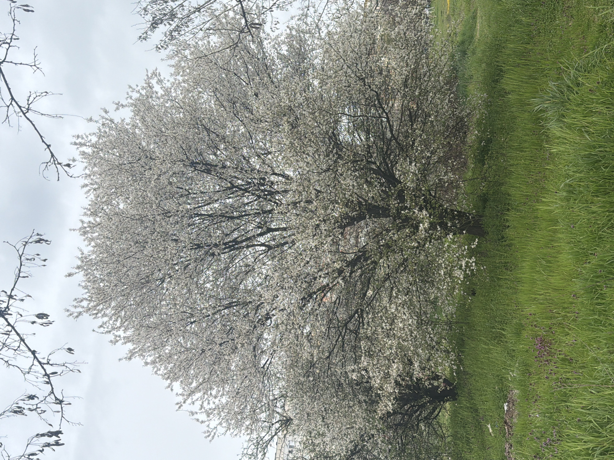 The image captures a blossoming tree in Plovdiv, Bulgaria, likely during springtime. The tree, laden with white flowers, stands adjacent to a field of tall, green grass interspersed with some purple wildflowers. The sky is overcast.