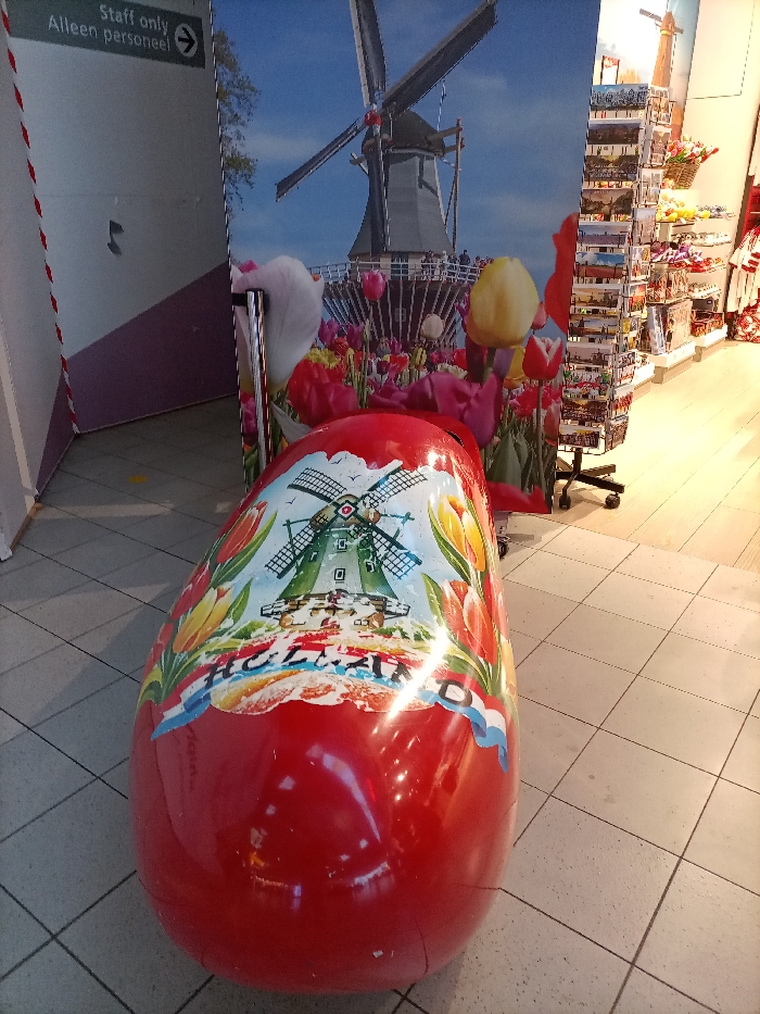 The image depicts an indoor commercial or transit area, specifically identified as within the city of Schiphol, Netherlands. In the foreground, a large, glossy red, ovoid sculpture is positioned on light-colored square floor tiles. This sculpture features a decorative painting on its upper surface, displaying a traditional green Dutch windmill, vibrant red and yellow tulips, and the word "HOLLAND" inscribed on a banner with red, white, and blue stripes. Behind this sculpture, a tall, rectangular banner or display poster dominates the midground. This banner features a photographic image of a traditional Dutch windmill set against a clear blue sky, surrounded by a field of colorful tulips (pink, yellow, red, white). Small figures of people are visible on the windmill's platform within the poster image. To the immediate left of this banner, a light-colored wall segment is visible, bearing a sign in English and Dutch that reads "Staff only / Alleen personeel" accompanied by a right-pointing arrow. A red and white striped barrier element is also present on the left. To the right of the banner, a retail display rack containing numerous items, likely postcards or small souvenirs, is visible on wheels. Beyond this, a brightly lit shop interior with light-colored flooring and additional merchandise shelves is present, suggesting a souvenir or gift shop setting. No individuals are directly visible engaging with the depicted objects or environment.