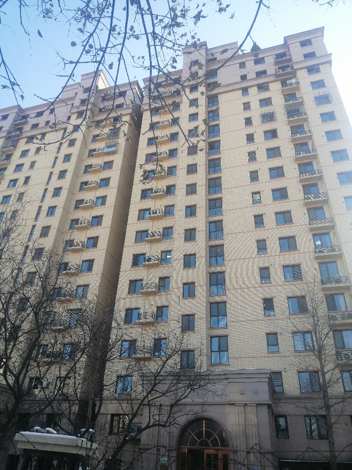 Two tall, beige apartment buildings stand side by side, viewed from a low angle. Each building has multiple stories of windows, some with small balconies or air conditioning units. Bare tree branches frame the top and sides of the buildings. The base of the buildings is marked by a grand entrance with an arched doorway and a decorative facade. The sky is visible at the top of the image, suggesting a bright but possibly overcast day.