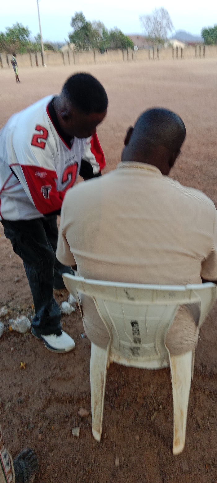 Two men are the focus of the image. One man, wearing an Atlanta Falcons jersey with the number "2" visible, is leaning toward the other, who is sitting in a white plastic chair. The seated man wears a tan shirt. The background shows a dirt field with scattered rocks and a few trees. The scene appears to be outdoors, possibly in a park or recreation area.