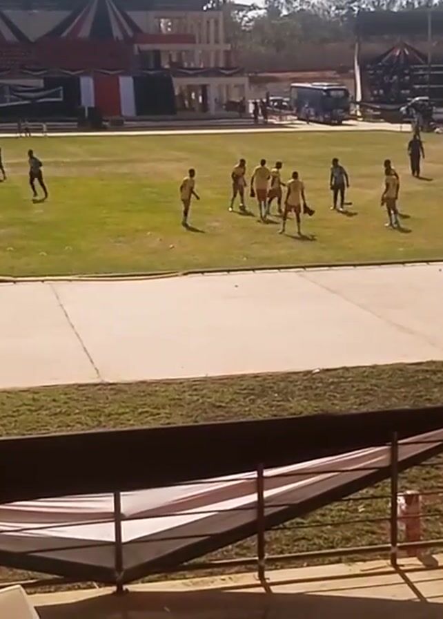 soccer team training on a green field in an outdoor stadium. The team members are wearing yellow and dark green uniforms. They are passing and kicking a ball. Behind them, there is a building under construction. Also visible are flags and decorations in the stadium stands. Some other people are also on the field.