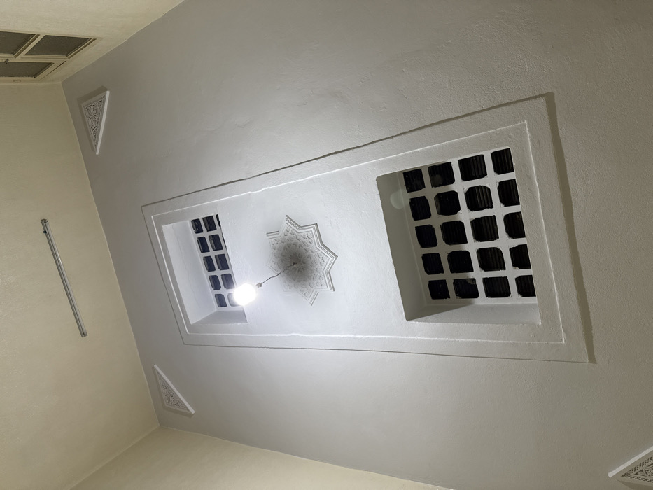 This image depicts the interior of a traditional Moroccan building in Fez, Morocco, likely a courtyard wall or stairwell. A tall, light-colored (off-white) wall dominates the scene, featuring a prominent, deep vertical recessed panel. Centered within this panel, a single incandescent light bulb hangs by a dark wire from an ornate, raised plasterwork medallion shaped as an eight-pointed star, exhibiting intricate geometric carving. Above and below this central medallion are two identically sized recessed rectangular openings, each fitted with a grid of dark, square apertures, approximately five rows by five columns, serving as ventilation grates or decorative screens. Further architectural details include two smaller, triangular plasterwork elements with carved patterns, positioned in the upper corners of the main wall. A single fluorescent tube light fixture is mounted on the light-colored ceiling. A multi-paned window, composed of at least four square sections, is partially visible on an adjacent wall in the upper right corner of the frame. The scene is brightly illuminated by artificial light, casting soft shadows. No individuals, subjects, or active interactions are present.