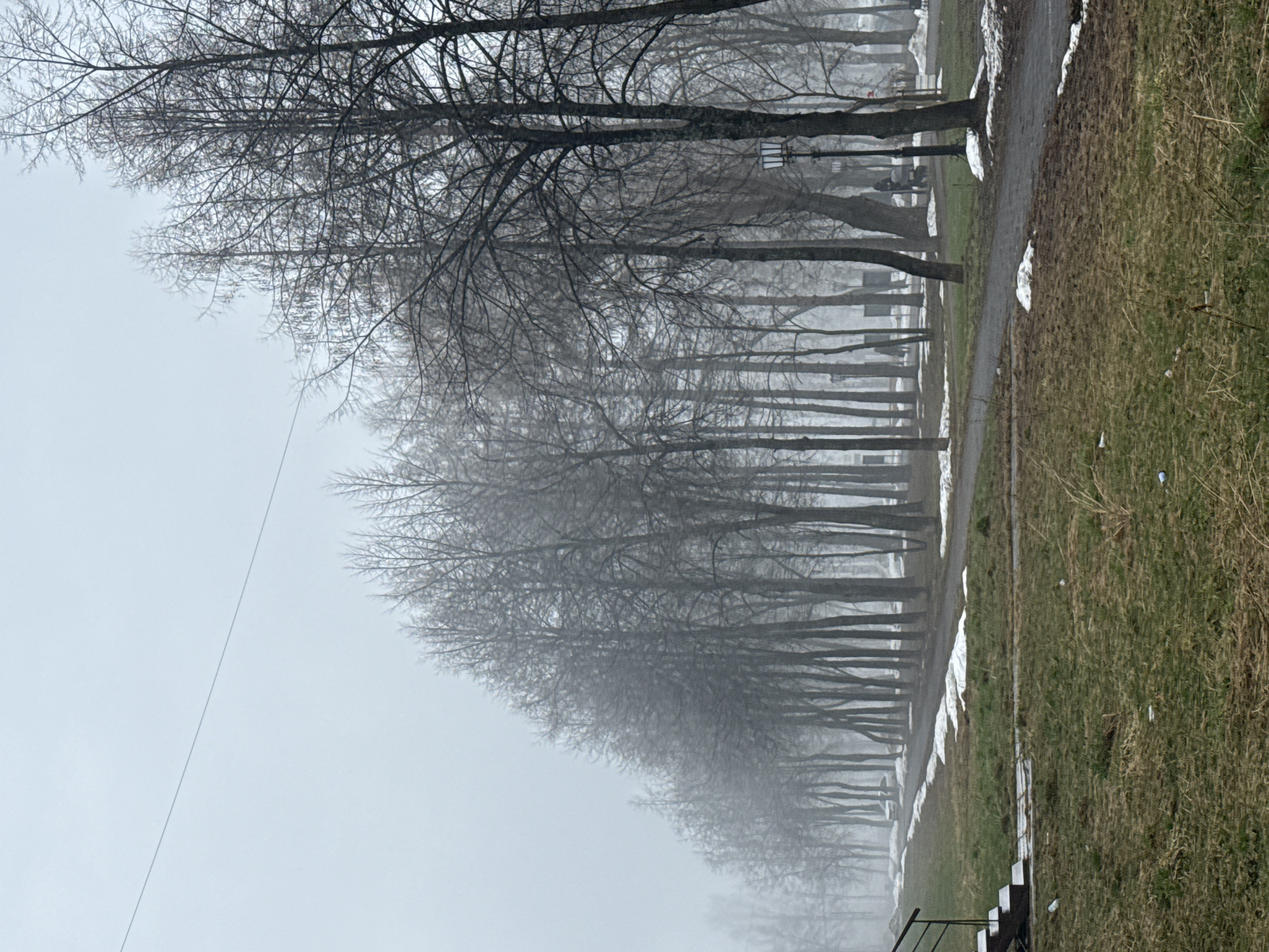 The image depicts a foggy scene in Chaikovsky, Russia. A row of bare trees lines a pathway with grass on either side. Patches of snow are visible on the ground near the pathway. A single power line extends across the upper-left portion of the sky. The trees recede into the fog in the distance. A section of a fence is in the bottom-right of the image.