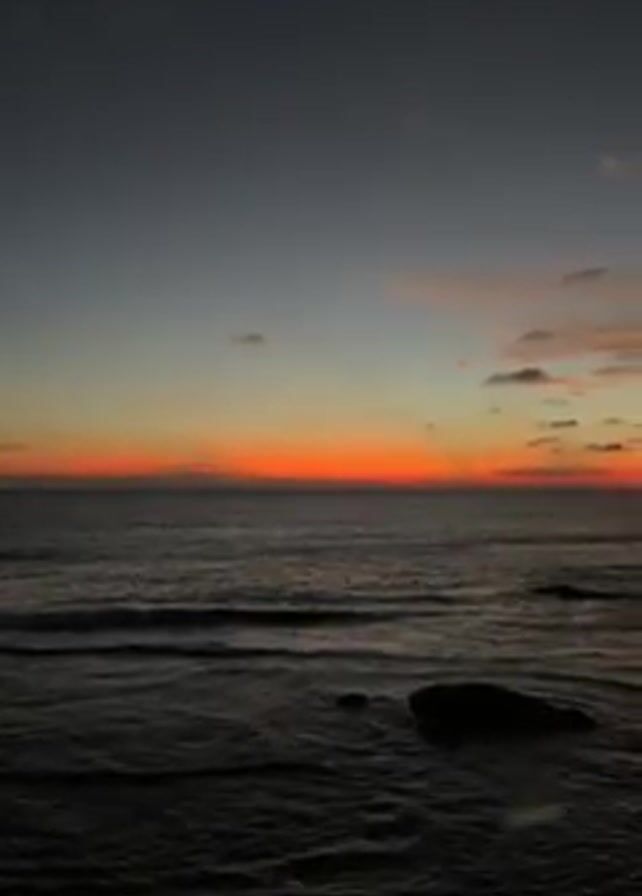 twilight seascape. The sky transitions from a dark grey at the top to orange and yellow hues near the horizon. Thin clouds are scattered across the sky. The ocean water appears dark, with gentle waves rolling toward the viewer. Several dark, indistinct rocks are visible in the foreground, partially submerged in the water. The overall impression is of a serene and tranquil setting.
