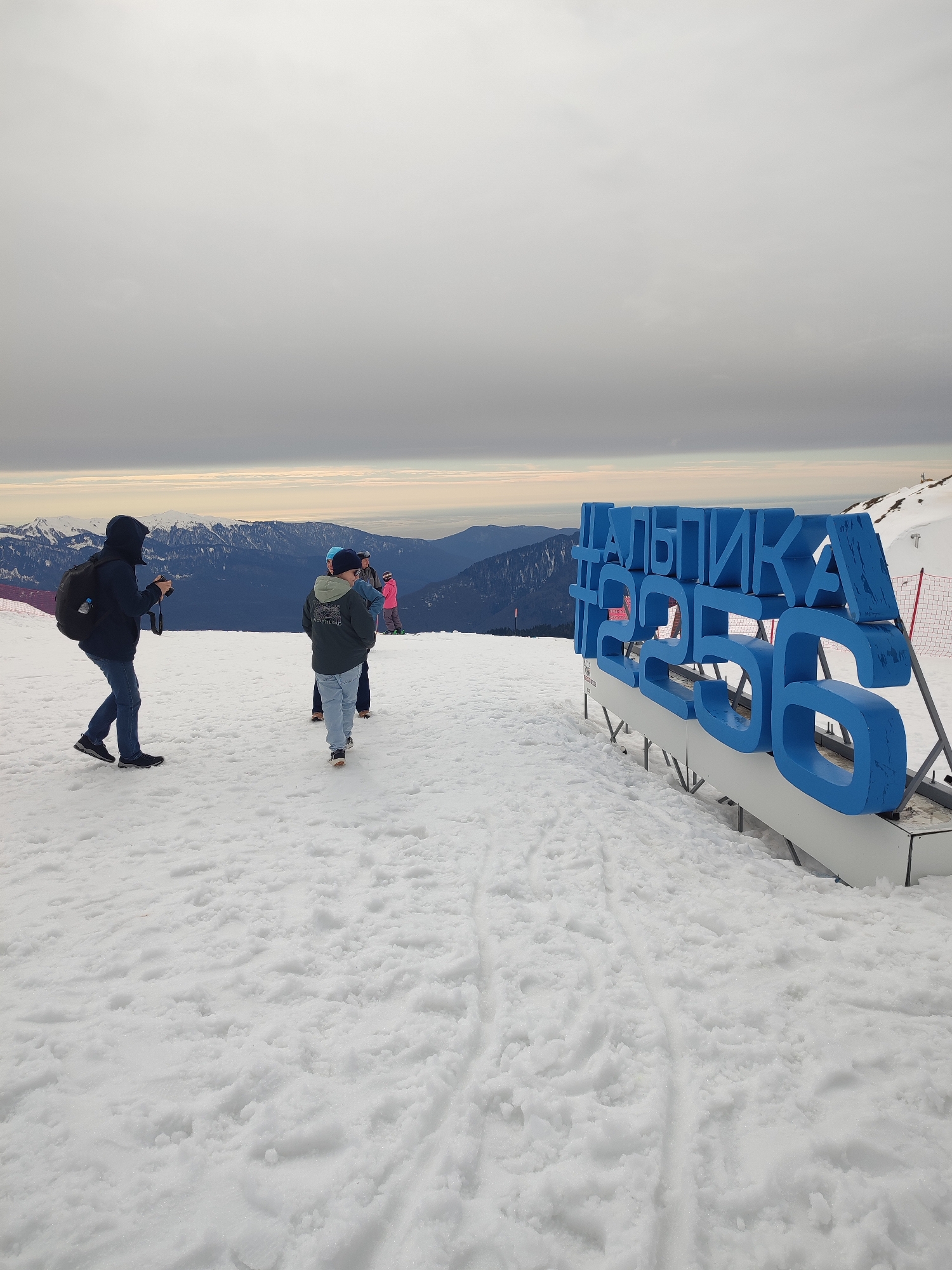 snow-covered landscape with a large blue sign reading "ALPINE #2256" in Cyrillic characters. Located in Estosadok, Russia, the sign is likely a landmark or marker for a specific location in the alpine region. Several people are present: one man with a backpack is standing to the left, holding what appears to be a camera. Another small group of people is standing in the background looking towards the mountain range. The sky is overcast and the mountain range is visible in the distance. A red safety net is visible on the right of the image in the distance. The ground is covered with packed snow.