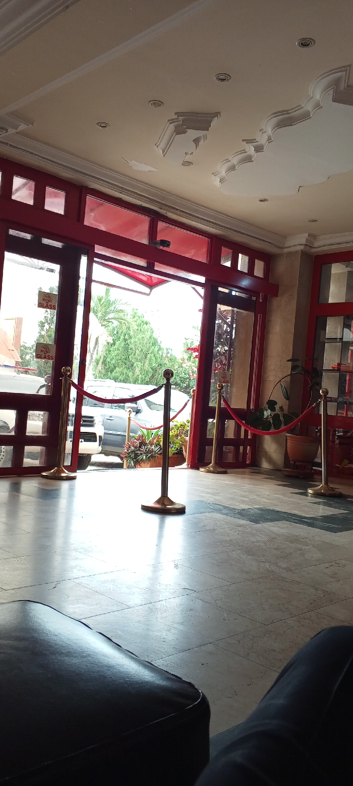 hotel lobby or entrance area. Red-framed glass doors lead to the outside, where a couple of cars are parked amid greenery. Golden stanchions with red velvet ropes are placed at the entrance. The interior features tiled floors and a decorative ceiling with recessed lighting. A potted plant is visible near a pillar on the right side. The bottom portion of the image captures part of a dark leather couch and a person's legs.