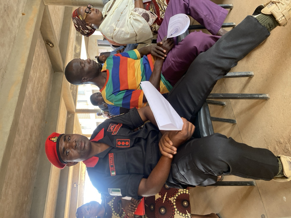 The image displays an indoor gathering in Hayin Banki, Nigeria, beneath an exposed concrete slab ceiling with visible support beams. Three individuals are prominently seated in the foreground on black metal-frame chairs. On the left, a male in a black short-sleeved uniform shirt with red collar and epaulet trim wears a red beret with an insignia. His uniform includes a Nigerian flag patch, a "UH NWACHI" name tag, "NSCDC" insignia, and three red square symbols on his left chest area. He wears black trousers and khaki-colored boots with dark green socks. His hands are clasped over a stack of white papers folded lengthwise, resting on his lap. He looks directly forward with a neutral expression. To his right, a second male is seated, wearing a multi-colored horizontal striped t-shirt and dark purple trousers. He appears to be looking downwards or slightly to his right. His hands are clasped in his lap. To the right of the second male, a female is seated, wearing a white patterned headscarf and a light-colored patterned top or shawl over purple trousers. She holds a rolled paper in her right hand and also appears to be looking downwards. On the far left, a portion of another female in a patterned dress is visible. The background is blurred, showing additional seated individuals, some wearing blue shirts, within an open concrete structure, indicating a larger assembly. The lighting suggests an open-sided venue or an area with significant natural light. The floor is a light, earthy tone.