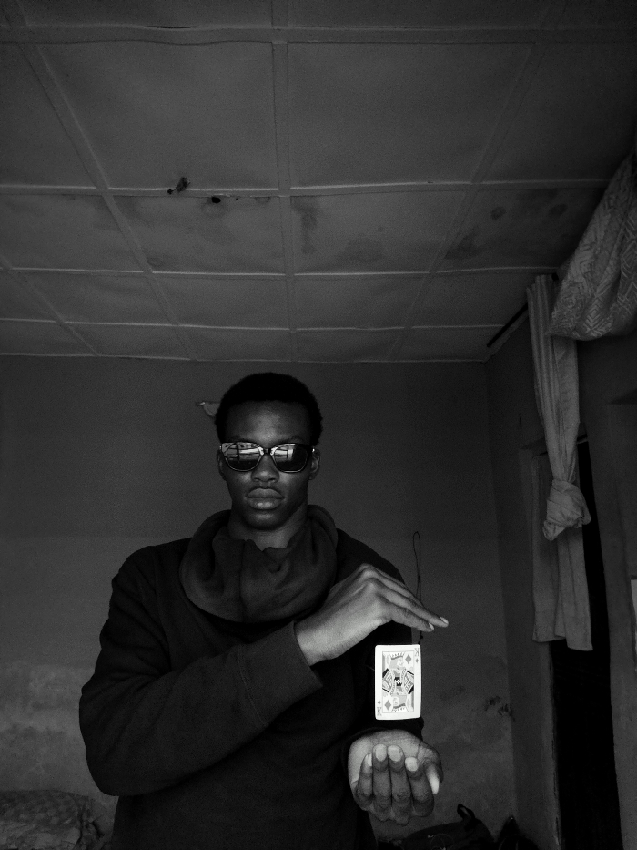 - "This black and white photograph captures a male individual performing a card illusion indoors in Keffi, Nigeria" by FM-88V7z1, licensed under CC BY 4.0
