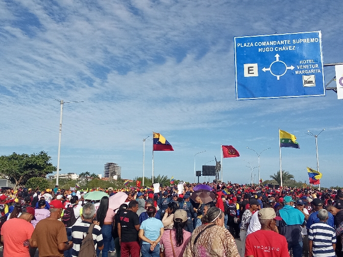 A large crowd of people is gathered outdoors during daylight under a partly cloudy blue sky. The location is identified by a prominent blue overhead road sign that reads "PLAZA COMANDANTE SUPREMO HUGO CHÁVEZ" and indicates directions to "HOTEL VENETUR MARGARITA," placing the scene in Porlamar, Venezuela. The crowd, comprising individuals of various ages dressed in casual clothing, occupies the lower two-thirds of the frame and extends into the distance. Several people in the crowd are holding umbrellas. Multiple flags are visible, including several Venezuelan national flags (yellow, blue, red with stars), at least one solid red flag with a yellow emblem, and a flag with horizontal yellow, green, and blue stripes with white stars. Modern streetlights are positioned along what appears to be a wide roadway or open area. In the background, distant buildings, including a partially constructed high-rise, and some trees are visible.