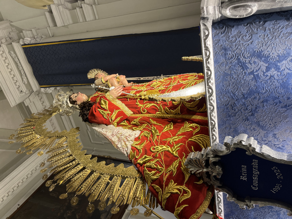 This image captures a close-up, elevated view of a religious statue assembly, likely within a church or religious building in Guatemala City, Guatemala. The central figure is a statue of the Virgin Mary, depicted as a queen, holding the Infant Jesus. The Virgin Mary statue is dressed in a flowing, deep red velvet gown heavily embroidered with intricate gold foliage patterns. She wears a silver crown adorned with jewels and a large, elaborate gold sunburst halo radiating from behind her head. A white lace mantle with a scalloped edge is draped over her shoulders. Her face is pale with slightly rouged cheeks, and dark hair is visible beneath her crown. She holds a silver scepter in her left hand (partially obscured) and cradles the Infant Jesus in her right arm. A rosary with white beads and a small silver crucifix hangs from her right hand. The Infant Jesus statue, also light-skinned, wears a smaller gold sunburst halo and a small gold crown. The statues stand on an ornate platform. The front and sides of this platform are covered in a rich blue velvet fabric featuring a raised, damask-style patterned texture. The platform's edges are constructed from carved wood, painted in a metallic silver-grey finish, displaying decorative moldings and volutes. A silver-framed plaque is affixed to the front of the platform, bearing the engraved text: "Reina Consagrada 1995 - 2025." The background reveals architectural elements of an interior space. White walls with classical moldings and cornices are visible, along with a vertical panel of dark blue fabric or a banner hanging on the right side. A large, dark-toned painting is partially visible on the upper left wall. The lighting appears to be artificial, illuminating the statues from the front.