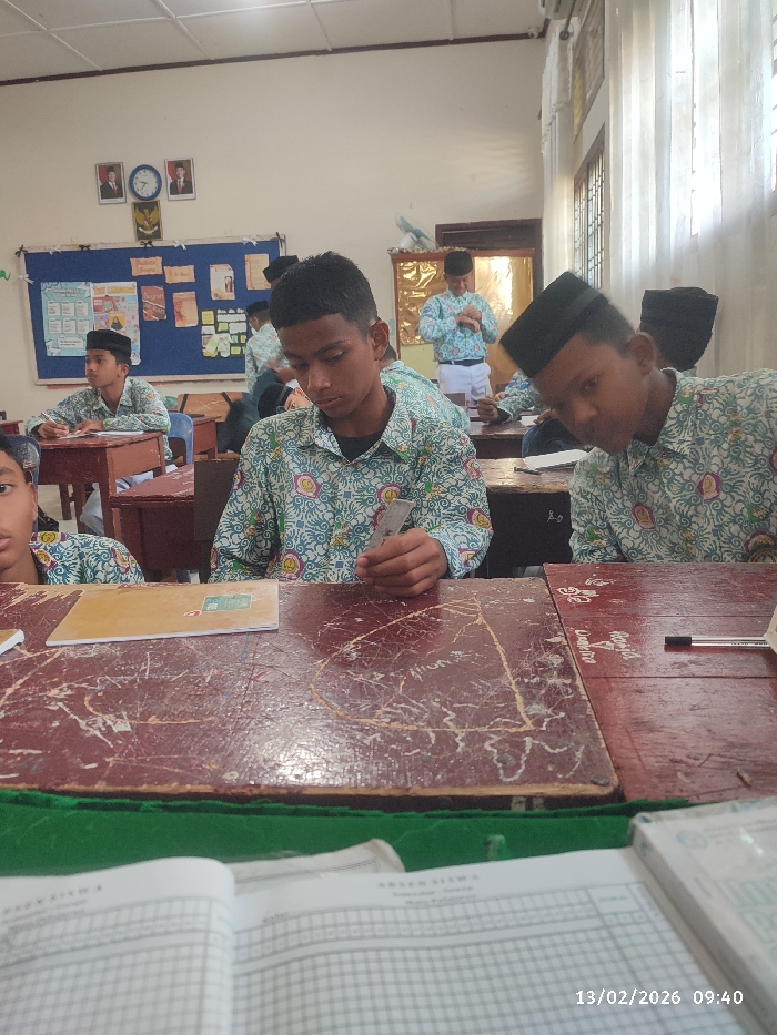 An indoor classroom scene shows several students seated at desks. The students are wearing matching patterned shirts. One student is looking at a small, rectangular object in their hands. The desks are old and scratched. There's a bulletin board with pictures and papers on the wall, as well as photos and a clock above it. Sunlight streams through windows with curtains. A date stamp indicates the photo was taken on February 13, 2026.