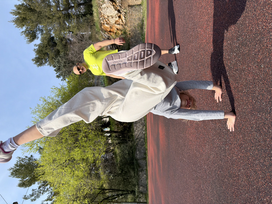 The image depicts an outdoor scene on a reddish-brown, speckled sports court in Grad Rijeka, Croatia. In the foreground, a young child, wearing a gray long-sleeved shirt, light beige loose-fitting trousers, white socks, and light pink athletic shoes (the sole of the right shoe visibly marked "GEOX"), is performing a handstand. The child's hands are placed flat on the court, with legs extended vertically upwards and head visible between the arms. To the right and slightly behind the child, an adult male stands upright, observing. He is bald, wears dark sunglasses, a bright neon yellow short-sleeved t-shirt, dark shorts, and white and black athletic shoes. The background consists of lush green deciduous and evergreen trees, a rocky hillside to the right, and a stone retaining wall partially visible on the left. The scene is illuminated by bright natural light under a clear blue sky, casting distinct shadows on the court.