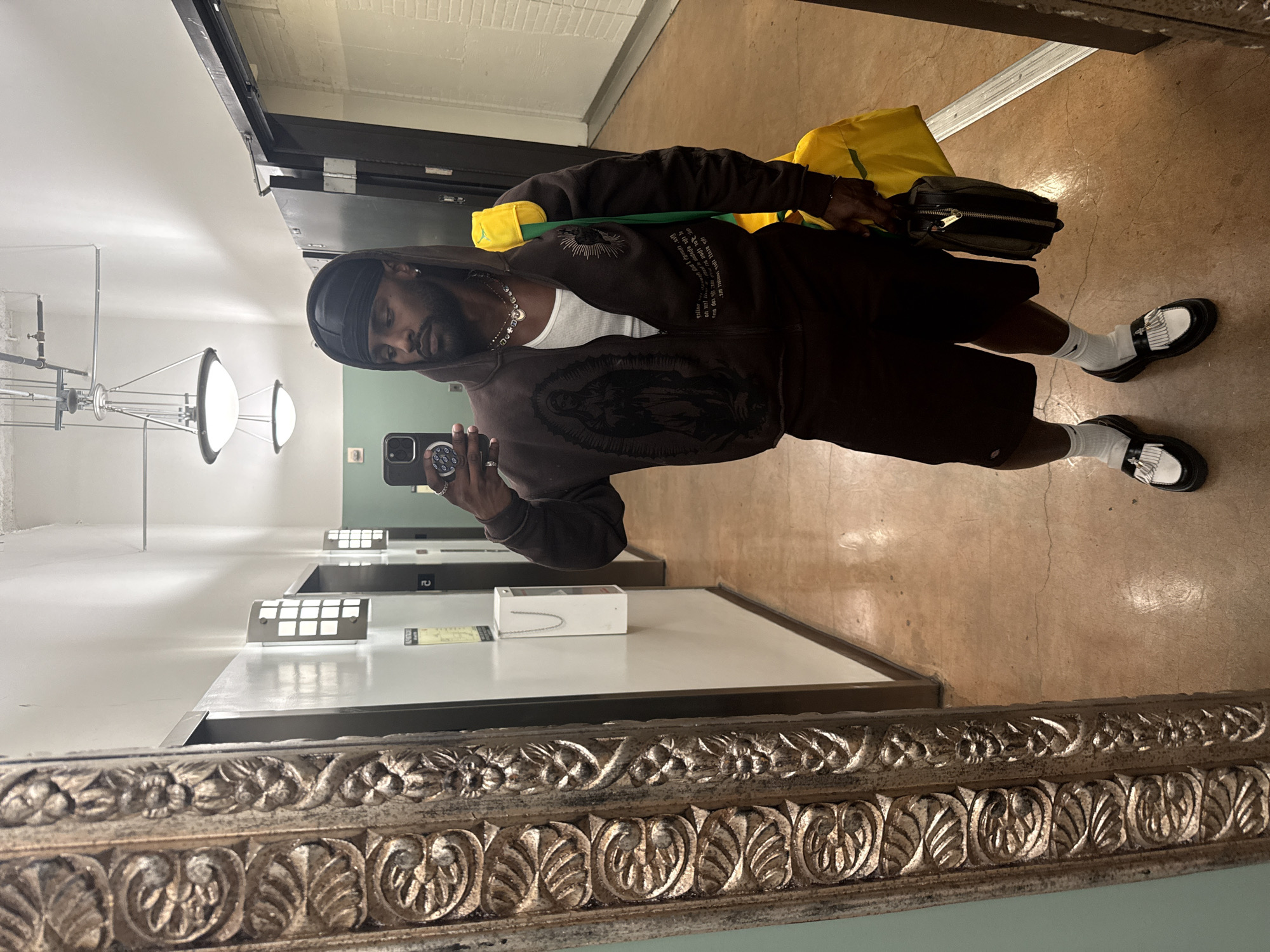 A mirrored selfie reveals a man indoors, holding a phone up with his right hand. He is wearing a dark brown zip-up hoodie with a graphic of the Virgin Mary on it, paired with dark shorts, white socks, and black and white loafers. He also sports a black durag and a silver chain. He is holding a large yellow bag and a black bag. The mirror reflects a hallway with white walls, recessed lighting, and a pale brown floor. There are white boxes on the countertop. The mirror itself has an ornate, decorative frame. Location: The location is an interior space within a city, most likely Los Angeles in the United States of America.