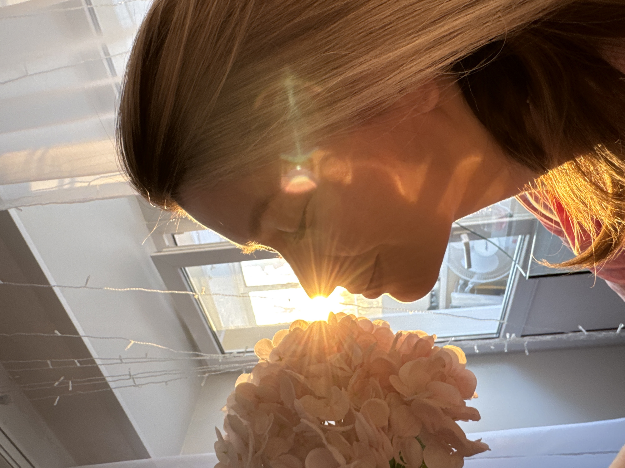 The image captures an indoor scene in Chaikovsky, Russia, during daylight. A female individual, seen in profile from the right, has her face angled towards a large cluster of light pink artificial flowers, positioned on the left side of the frame. Her long, light brown hair frames her face, which is bathed in warm, golden sunlight. Her left eye appears closed or squinting due to the intense light, and her nose is in close proximity to the flower petals. Strong sun flare emanates from behind the flowers and across her face. In the background, vertical strands of white decorative string lights are suspended. A window or balcony door allows bright sunlight to enter, partially obscured by sheer white curtains on the left. An indistinct, possibly fan-like object is vaguely visible through the window. The interior walls appear light-colored. The individual is wearing a garment with a visible red or pink hue on her left shoulder/neck area.