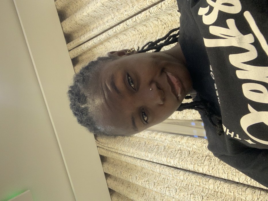 A woman with dark skin, dark eyes, and a nose ring smiles at the camera. Her hair is styled in braids and short natural hair. She wears a black sweatshirt with white lettering. The background shows a tan and cream-colored curtain and a beige wall. The image is rotated, with the left side of the image at the top.
