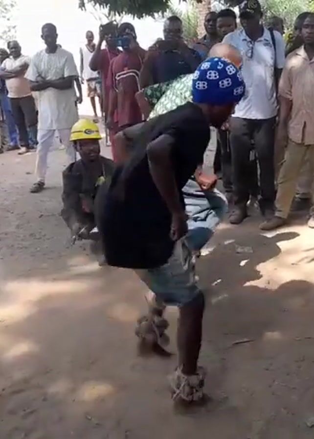 A gathering of people surrounds two individuals in a dirt-covered area. These two individuals are dancing. One of them is wearing a black shirt and denim shorts, with objects tied to their feet. The other person is wearing a green patterned shirt. A crowd of men of various ages and wearing different clothing, are looking on. One man in a yellow construction hat is kneeling and writing on a piece of paper. Some people in the crowd are holding cell phones, possibly recording the event. The location appears to be an outdoor setting, with a building visible in the background and trees providing some shade. The mood seems festive and focused on the dance.