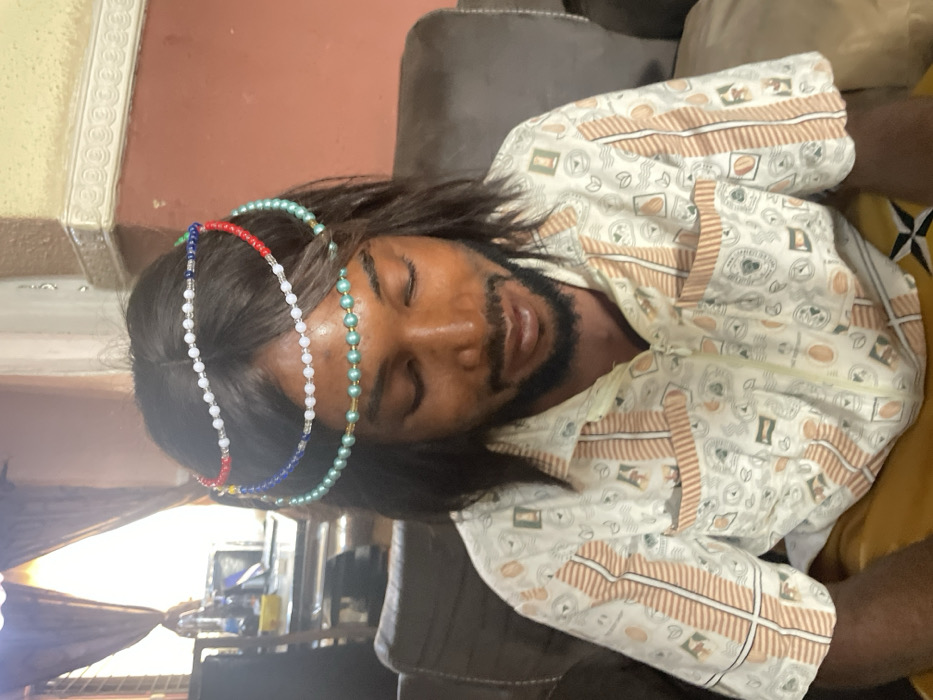 A single individual, appearing to be an adult male with a dark complexion and a dark beard, is depicted in a medium shot. The individual wears a long, dark wig or hair extending to the shoulders and looks downwards with eyes closed or nearly closed. Adorning the head is a three-tiered beaded headpiece: the top strand combines white, blue, and red beads; the middle strand consists of white beads; and the bottom strand features light teal/aqua beads, some with gold accents. The individual is dressed in a short-sleeved, collared shirt with a light background patterned with vertical tan stripes and various small, abstract grey and brown symbols. The subject is seated on a dark brown upholstered sofa or chair within an indoor setting. The background shows a wall painted in a light reddish-brown or terracotta color, with a window and curtains visible on the left, and a decorative white molding in the upper right. Blurred objects, including bottles and a framed item, are dimly visible on a piece of furniture in the left background. The specific location within Jos, Nigeria, is not determinable from the visual information provided.