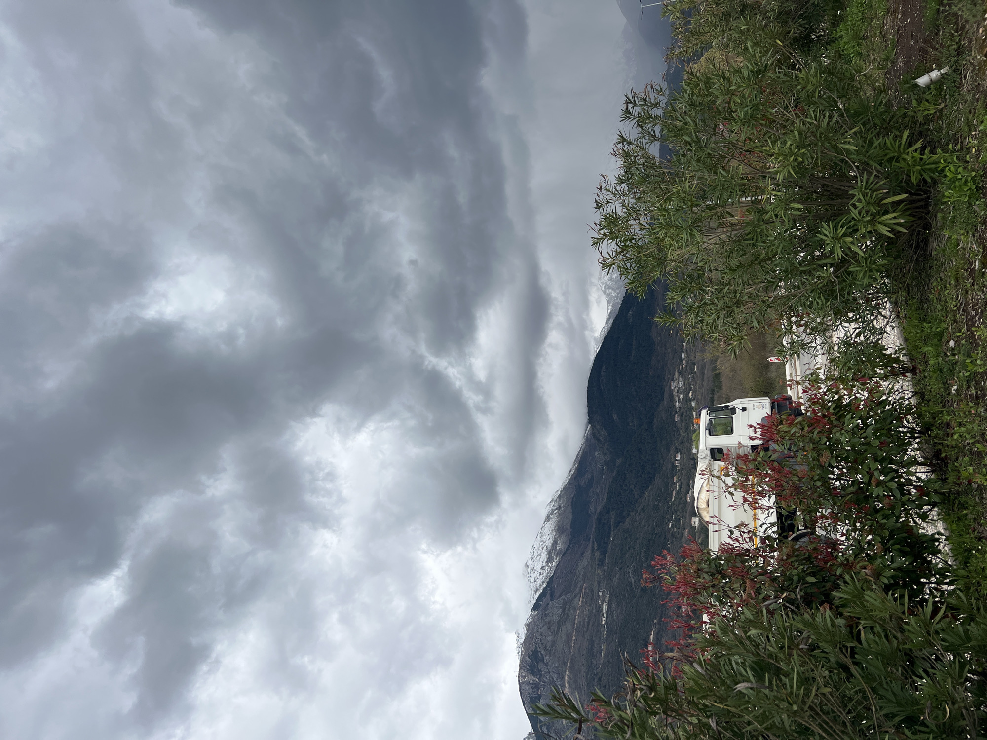 The image depicts a mountainous landscape in Dub, Montenegro, under a heavily overcast sky dominated by dark grey clouds. In the foreground, dense green and red-tipped bushes partially obscure an asphalt road. On this road, in the midground, a white utility truck is visible; it features a white cabin, an amber warning beacon on its roof, and a covered rear cargo compartment. The background is composed of a prominent mountain range with snow-capped peaks. The lower slopes of these mountains are covered in dark green vegetation and dotted with scattered white residential buildings. The atmospheric conditions suggest a cloudy day, with distant precipitation visible on the far right.
