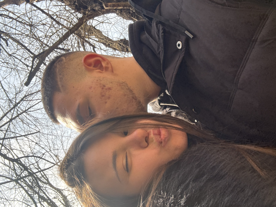 The image features two individuals, a female and a male, in an outdoor setting. The female is in the foreground, positioned to the left, looking directly at the camera with her left eye closed in a wink and her lips puckered. She has long dark hair that partially covers her face, and her left shoulder is adorned with dark fur trim, suggesting a coat or jacket. The male is positioned behind and to the right of the female, with his eyes closed, kissing her on the left temple. He has short dark hair styled with a faded cut and a shaved line on the right side, light stubble along his jawline, and visible acne on his right cheek. He wears a black hooded puffer jacket. The background consists of a dense network of bare, dark tree branches against a bright, hazy sky, indicative of a leafless season. Direct sunlight illuminates the scene from the upper left. No specific landmarks or unique environmental features are discernible to pinpoint a location within Madara, Bulgaria.