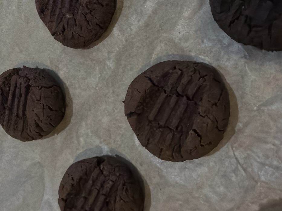 - "An overhead, slightly angled forensic view depicts five dark brown, circular baked goods, identified as cookies, resting on a sheet of light grey, wrinkled parchment paper" by FM-gJDOi2, licensed under CC BY 4.0