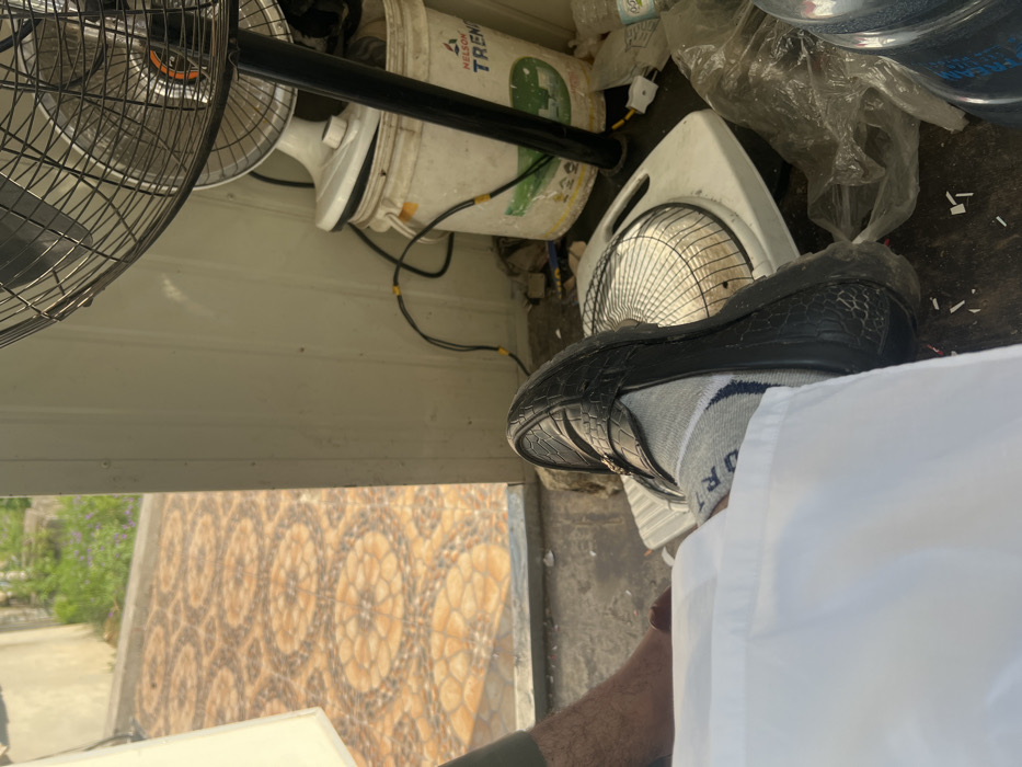 The image depicts an interior view looking out through an open doorway, set in Islamabad, Pakistan. A person's lower legs and feet are visible in the foreground. The partially visible left leg is bare below a dark garment. The right leg is covered by a white garment, indicative of a Shalwar, and wears a light grey sock with dark stripes and the text "ORT". This foot is shod in a black, textured loafer-style shoe featuring a gold-colored buckle, and rests elevated on a white, square-shaped electric fan with a metal grill, positioned on the floor. To the right, a black pedestal fan stand is visible. Behind the smaller fan, a white plastic bucket with "NELSON" and "TREN" (likely "TREND") branding and green graphics is present. Yellow electrical wiring runs along the light-colored, paneled interior wall. The dark floor is cluttered with various items, including white plastic fragments, crumpled clear plastic bags, and the bottom portion of a blue tinted water bottle or dispenser. Through the open doorway, an outdoor area is visible, paved with light brown and dark brown/orange patterned tiles displaying concentric circular designs. Beyond the tiled area, green vegetation and a light-colored wall are visible under bright daylight conditions.