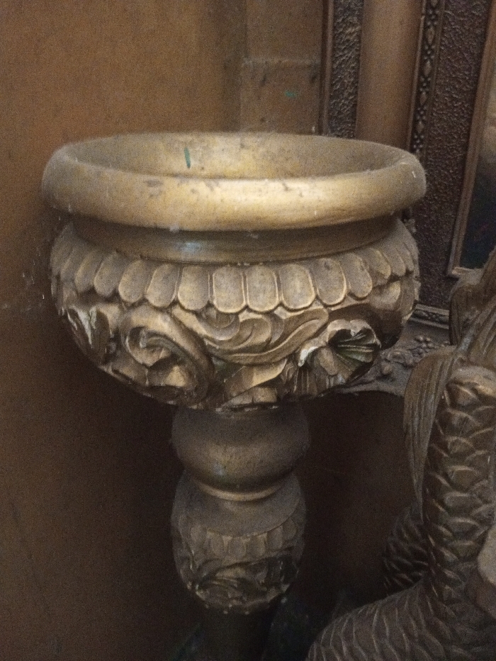 A tarnished, golden-colored vase or planter sits prominently, featuring a wide, bowl-like top with a rolled rim