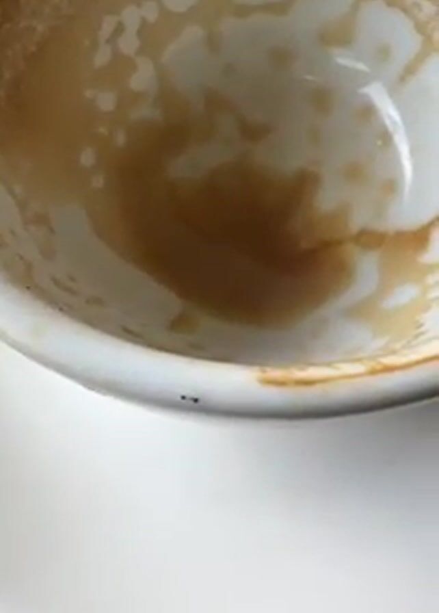 A close-up shot shows a white, half-eaten coffee cup resting on a white saucer placed on a wooden table. A brown coffee stain is visible inside the cup, along with white milk residue. Two ants crawl on the exterior rim of the cup.