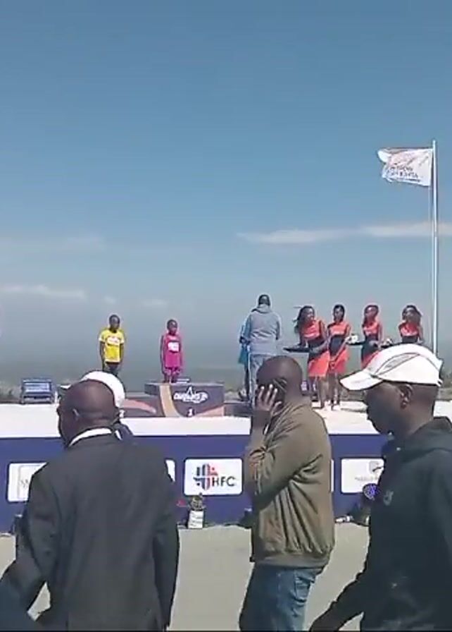 Certainly! Here is a description of the video you sent: The video shows a medal ceremony on a stage outdoors. Three children stand on a podium marked 1, 2, and 3. They appear to be the winners of a race. A man is presenting them with flowers and medals. Behind them, four women in orange dresses are holding trays, perhaps with additional awards or gifts. There are three flags in the background: one with the logo for World Athletics, one with a blue and yellow design, and the Kenyan flag. Several adults are standing around the stage, observing the ceremony. The area behind the stage provides a panoramic view of a landscape. Logos for sponsoring businesses can be seen on banners in the background and on the sides of the stage. The sky is clear and blue.