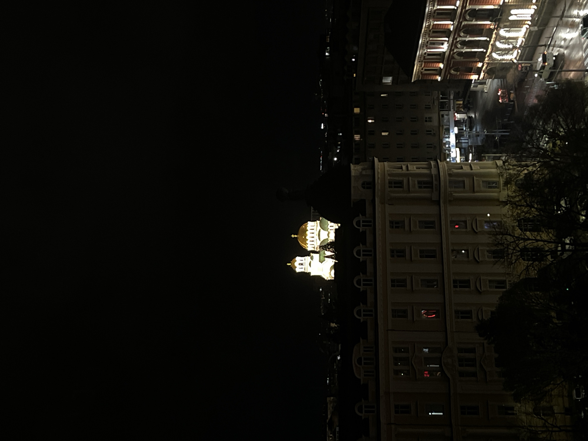 A nighttime cityscape in Sofia, Bulgaria, features illuminated buildings, including the Alexander Nevsky Cathedral with its distinctive golden domes. Other buildings are visible with lit windows and architectural details. Trees are silhouetted against the night sky in the lower right. Streetlights and faint car lights suggest traffic activity on the street. The overall scene has a nocturnal and urban feel.