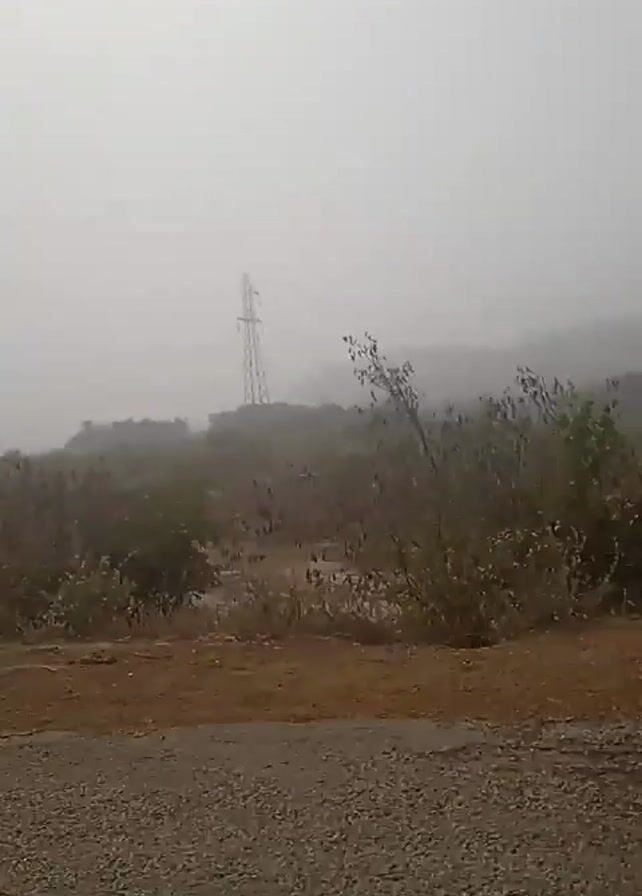 view from a vehicle moving along a cracked asphalt road, looking at a landscape shrouded in dense fog. Vegetation, including small trees and bushes, lines the sides of the road. An electrical tower is faintly visible in the distance through the fog. As the vehicle moves, the camera captures a reflection of the driver in the side mirror. The overall impression is one of limited visibility and rural scenery.