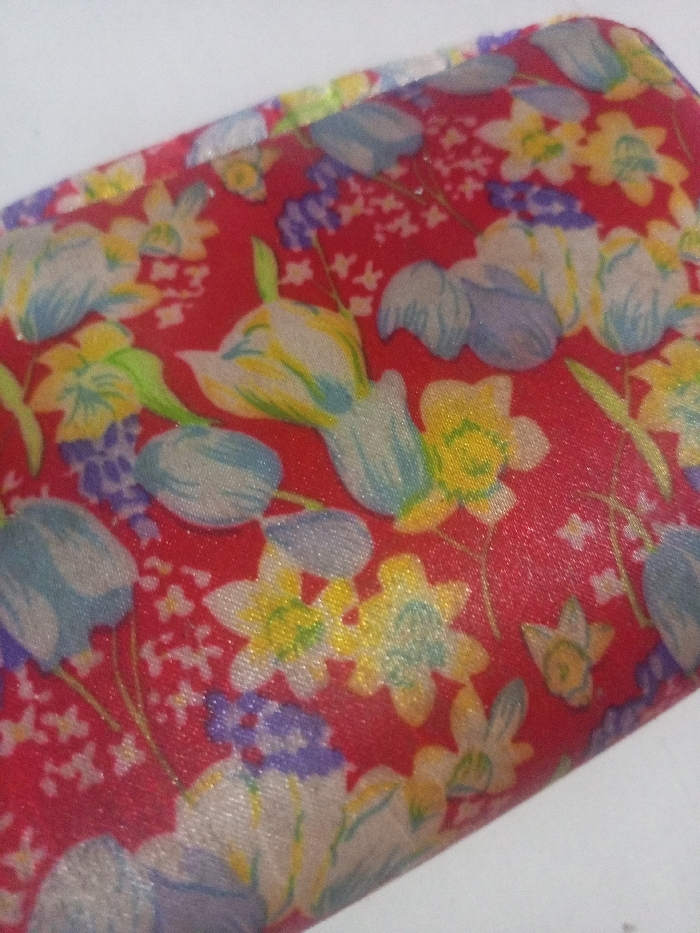 A small, oblong textile object with rounded corners is depicted, displaying a floral pattern against a red background. The pattern consists of various stylized flowers in yellow, light blue, white, and purple hues, accented by green leaf or stem elements. Some patterned areas exhibit a slight sheen. The object is resting on a plain white, uniform surface. No individuals, actions, or interactions are visible. The specific location within Zee Pin Kone, Myanmar, is not discernible from the image.