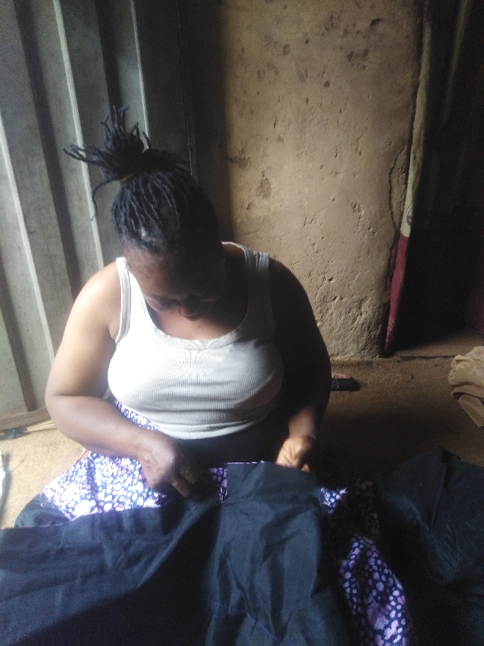 An adult female, with dark skin and dark dreadlocks styled into an upward bun, is shown from an overhead perspective, seated or kneeling on a floor. She is wearing a white, ribbed tank top and is focused downwards, manipulating two pieces of fabric with her hands: one solid black and another featuring a purple and white patterned design. The background consists of two distinct wall types: to the left, a corrugated metal surface with vertical ridges, and to the right, a textured, earthy-brown wall, possibly plaster or mud. A vertical strip of dark red fabric is visible against the right wall. The setting is an interior, dimly lit space. The location is Unknown, Unknown.