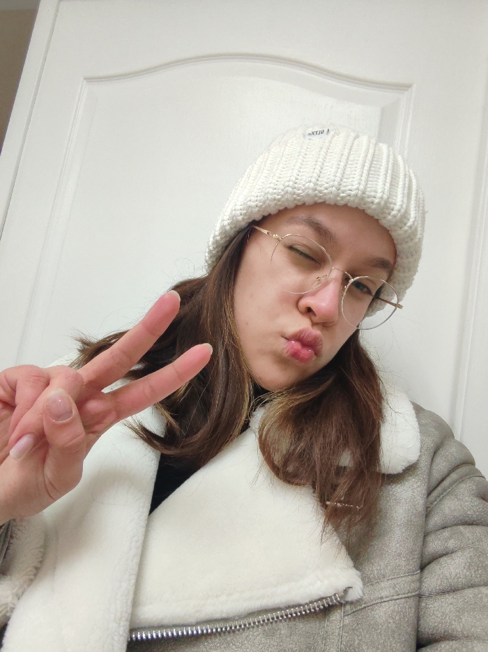 A single individual, appearing female, is depicted in a medium shot, facing the camera directly, positioned indoors against a plain white interior door. The person has medium-brown hair and wears gold-rimmed circular eyeglasses. They are dressed in an off-white ribbed knit beanie with a visible "XYJO" label (inverted) on the front, a black garment underneath, and a grey faux-suede jacket with off-white faux-shearling lining and an asymmetrical zipper. The individual's left eye (viewer's right) is closed or squinted in a wink, while the right eye (viewer's left) is open. Their lips are pursed into a pout. The left hand (viewer's right) is raised, fingers extended to form a peace sign. The background shows a white door with a subtle, arched panel detail.