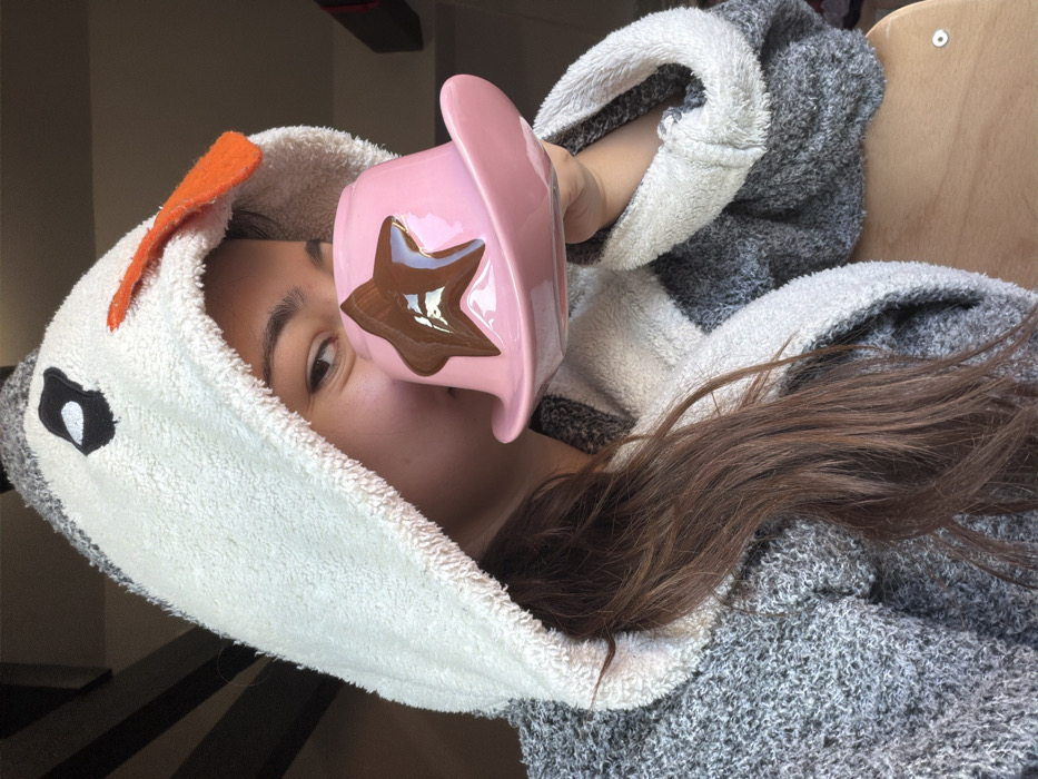A young woman is depicted in a close-up, indoor shot from the city of Bouxwiller, France. She is partially visible, facing slightly to the viewer's right, and looking towards the viewer with a slight smile. Her right eye is visible. She has long, dark brown hair. She is wearing a grey and white patterned, fuzzy hooded robe. The hood is pulled up and designed to resemble an animal, featuring white plush, black eye markings, and an orange beak-like protrusion. The woman holds a pink mug shaped like a cowboy hat, adorned with a raised brown star design on its front. She is actively drinking from the mug, which contains a dark liquid. In the background, a dark, curved structure, possibly part of a spiral staircase or railing, is partially visible on the left. A light-colored wooden surface is present in the lower right foreground.