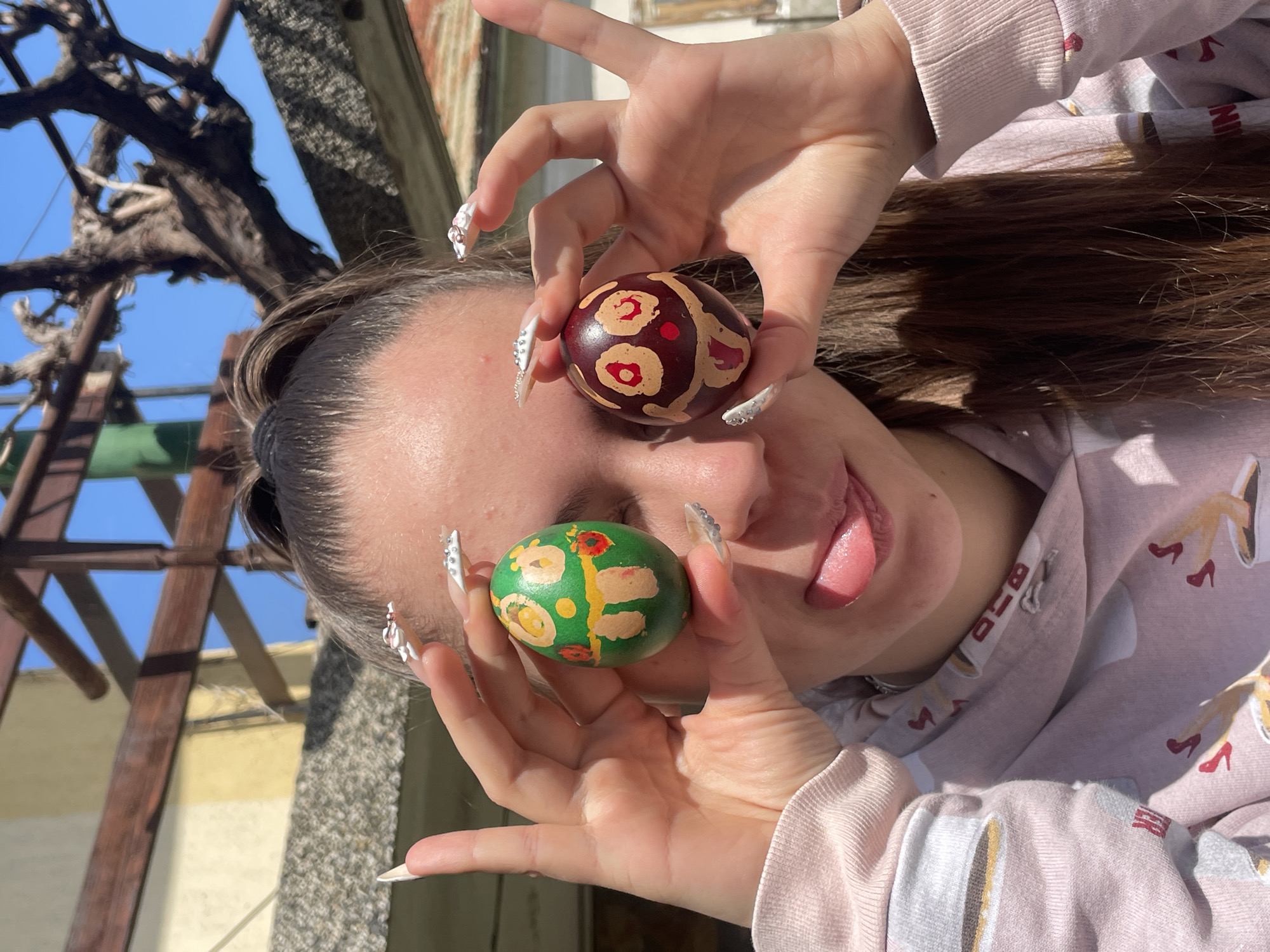 A young person is posing with decorated Easter eggs in what appears to be an outdoor setting