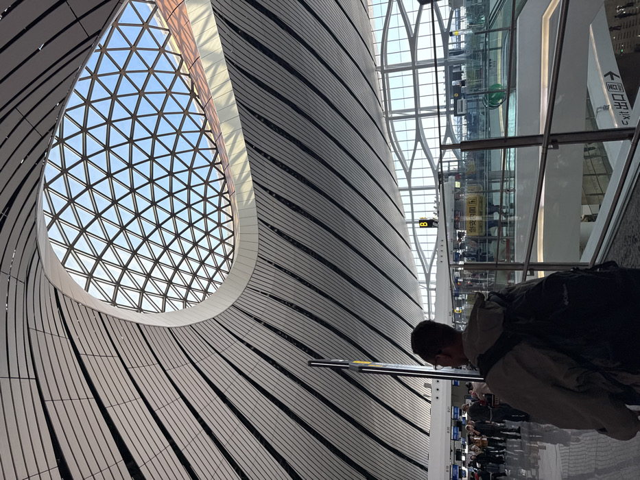 An interior view showcases a modern airport terminal. Striking architectural elements include a tear-drop shaped skylight with a triangular grid pattern and a wall featuring parallel lines. A person stands at a kiosk in the foreground, with a line of people stretching into the distance. The scene is captured from a low angle, emphasizing the building's scale. The color palette consists of neutral tones like white, gray, and beige, punctuated by black lines and hints of natural light from the sky.