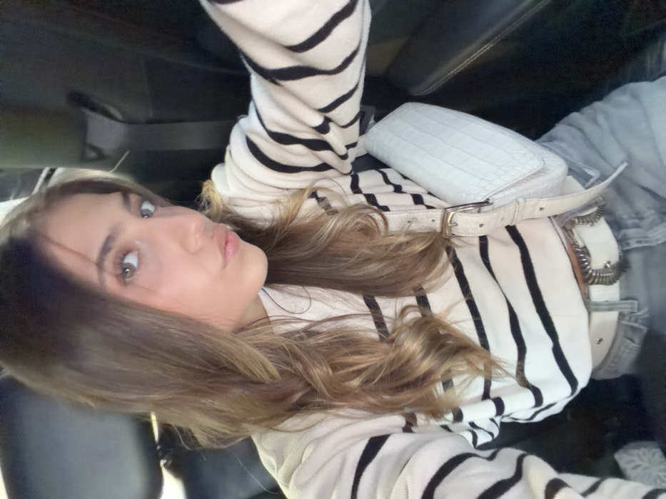 A young woman with shoulder-length wavy hair, wearing a black and white striped sweater, is shown from a side perspective. She has light eyes and fair skin. A white reptile-print bag with a matching belt is slung across her body. The setting appears to be inside a vehicle, with a dark seat visible in the background. She has a slight pout and looks directly into the camera.