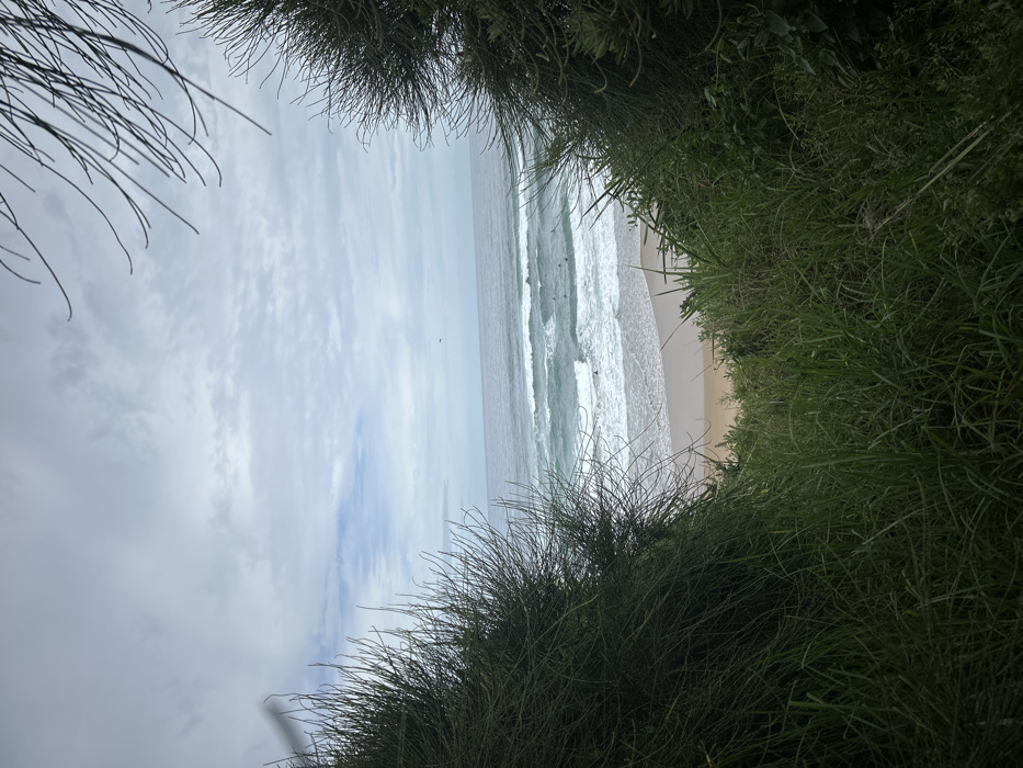 A beach scene is viewed through a natural frame of dense green grass