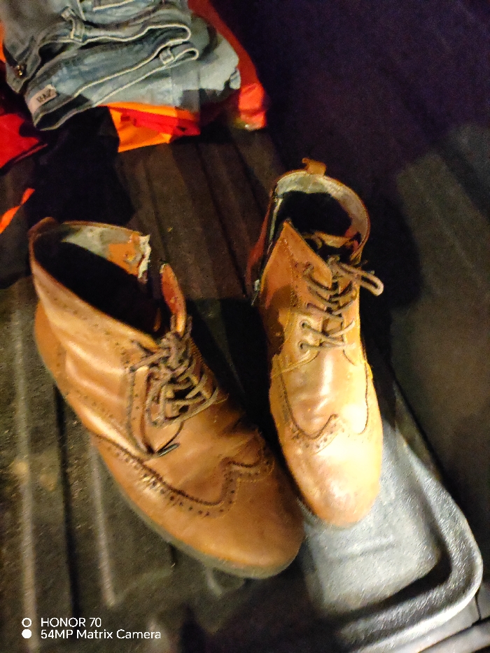 Two brown leather wingtip boots, laced, are positioned on a black surface. One boot stands slightly taller, showing its interior and a side zipper. A pile of clothing, including blue jeans and items with red and orange hues, appears blurred in the background above the boots. The boots seem well-worn, displaying creases and slight variations in leather texture. The setting appears to be in the back of a vehicle, given the ribbed texture of the surface underneath.