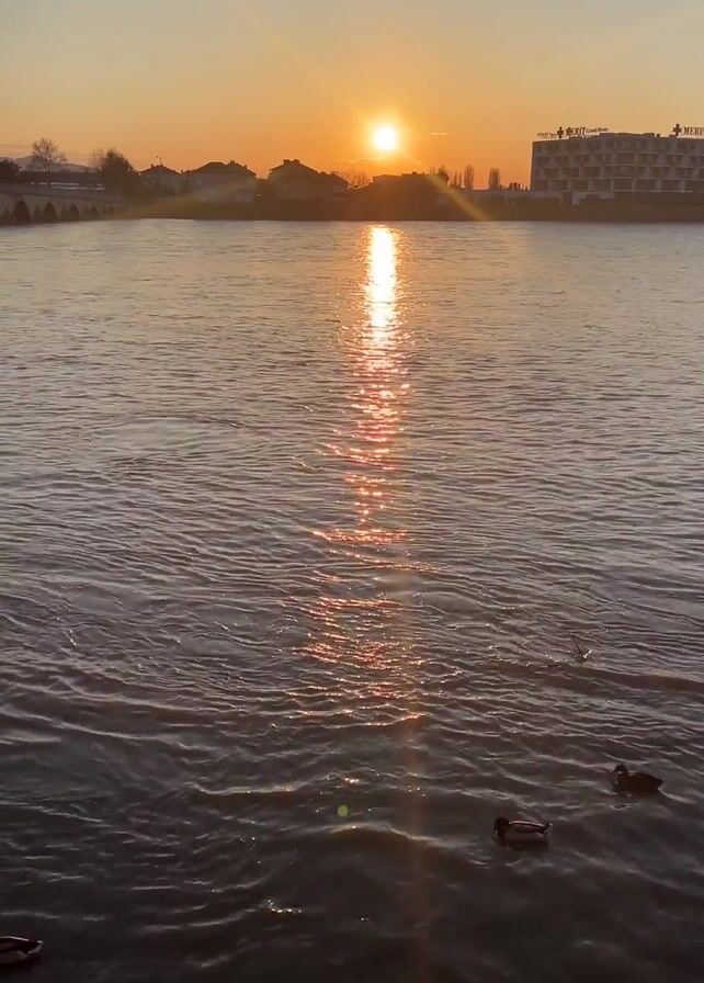 wide river at sunset. The sun is setting directly in the center of the frame, creating a bright glare on the water's surface. The glare forms a vertical line of light stretching from the sun towards the foreground. The river itself has gentle ripples and waves, with several ducks swimming on the surface. The ducks are mostly dark in color. A long stone bridge with multiple arches is visible in the background on the left side of the frame. On the right side of the frame, there is a large building with "MERIT" written on its roof. The skyline behind the river consists of houses and trees silhouetted against the bright sunset. The video is shot from a slightly elevated position, possibly from a bridge or embankment.